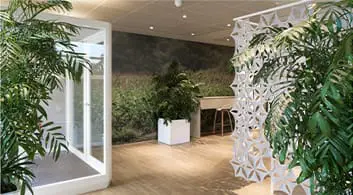 Med funktionelle beplantningsløsninger er det lykkedes at indrette naturlige oaser, som bidrager med farve i indretningen og sikrer et sundt indeklima.