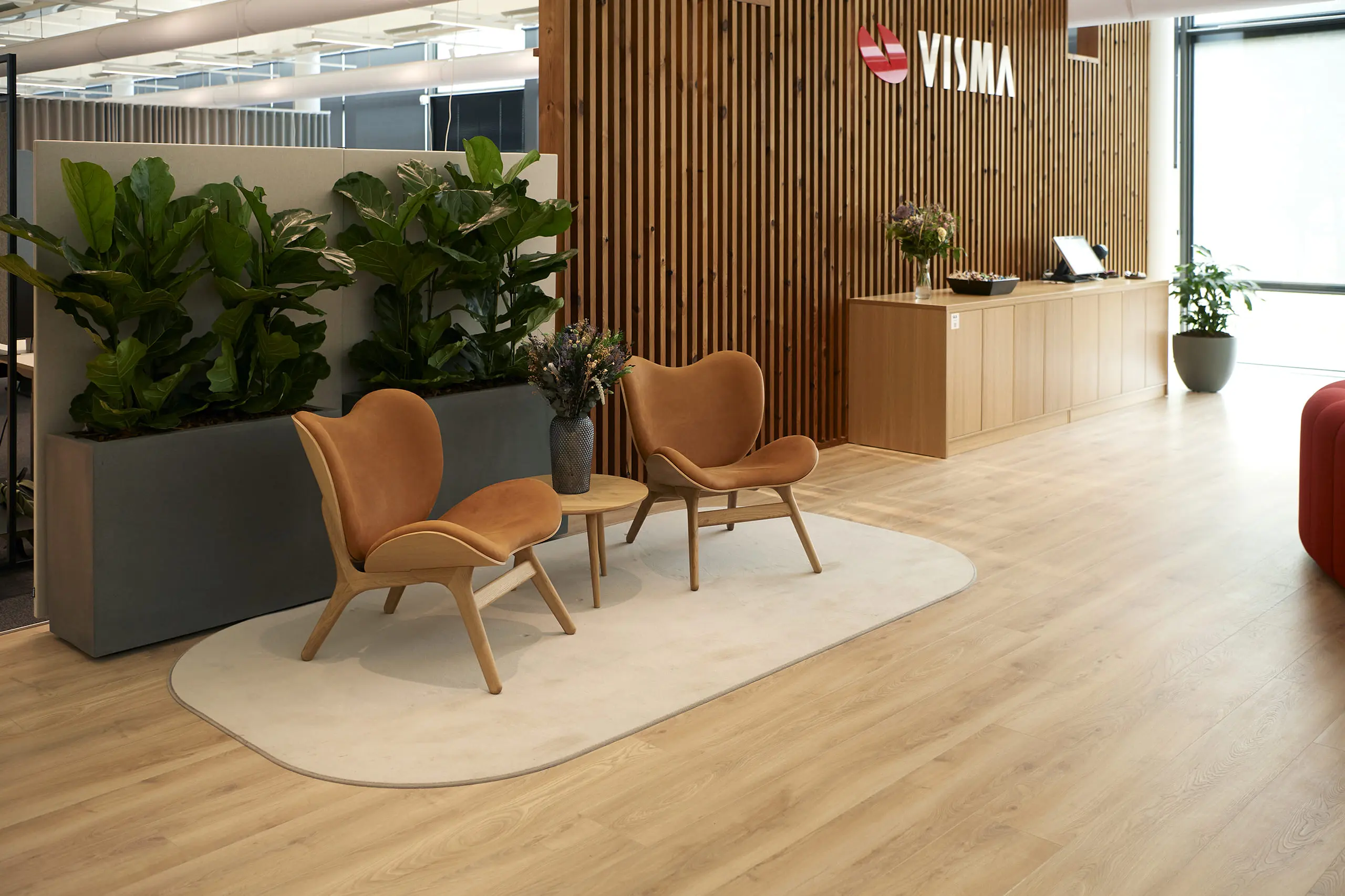 Vismas kontor er præget af åbne arealer, som skaber luft og lethed i indretningen. Beplantningen er strategisk udvalgt til at inddele omgivelserne i zoner og skabe privatliv for medarbejderne – til koncentreret arbejde ved skrivebordspladsen, et uformelt møde i sofaområde eller blot til at nyde frokostmåltidet i et inspirerende kantineområde.